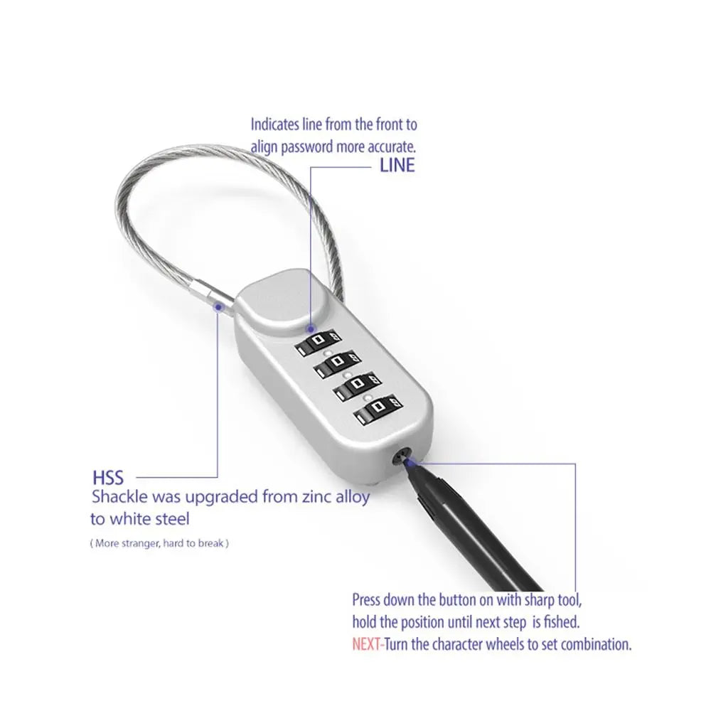 Portable 4-Digit Combination Lock – Zinc Alloy Anti-Theft Wire Rope Padlock for Luggage & Backpack Zippers