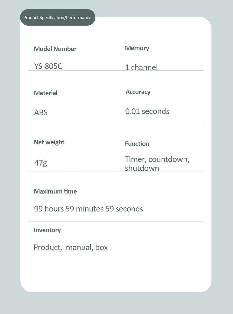 0.01-Second Precision: The YS-805C stopwatch delivers highly accurate timing with a precision of 0.01 seconds. Whether you're timing a sprint, a workout, or a scientific experiment, this stopwatch ensures you don’t miss a beat. For times exceeding one hour, it remains accurate to the second.