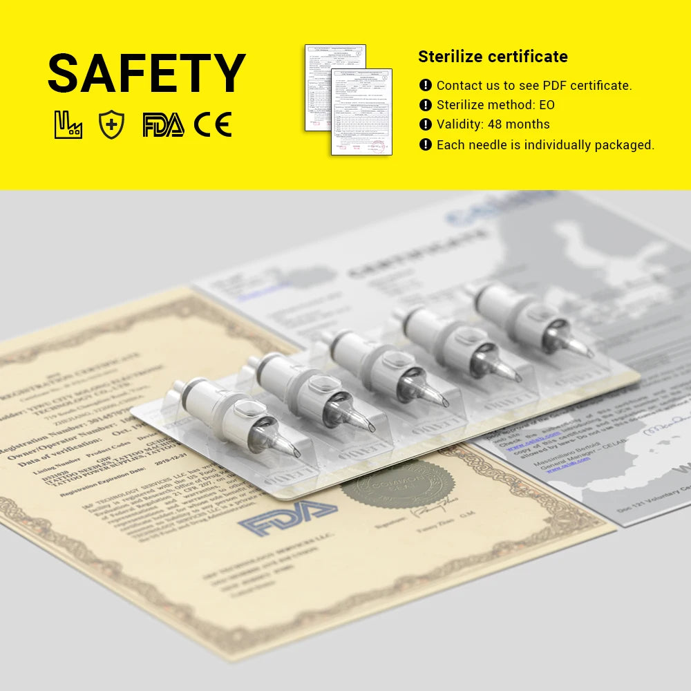 - Safe & Sterile: The cartridges are 100% EO Gas Sterilized, ensuring they meet the highest hygiene standards. Each needle cartridge is individually packaged, guaranteeing cleanliness and reducing the risk of contamination.