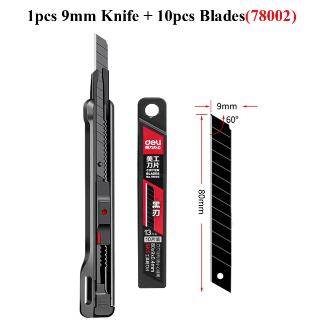High-Quality Carbon Steel Blades: Featuring black carbon steel blades, this utility knife ensures durability and sharpness. The retractable blades are available in two sizes, 18mm and 9mm, catering to various cutting requirements.