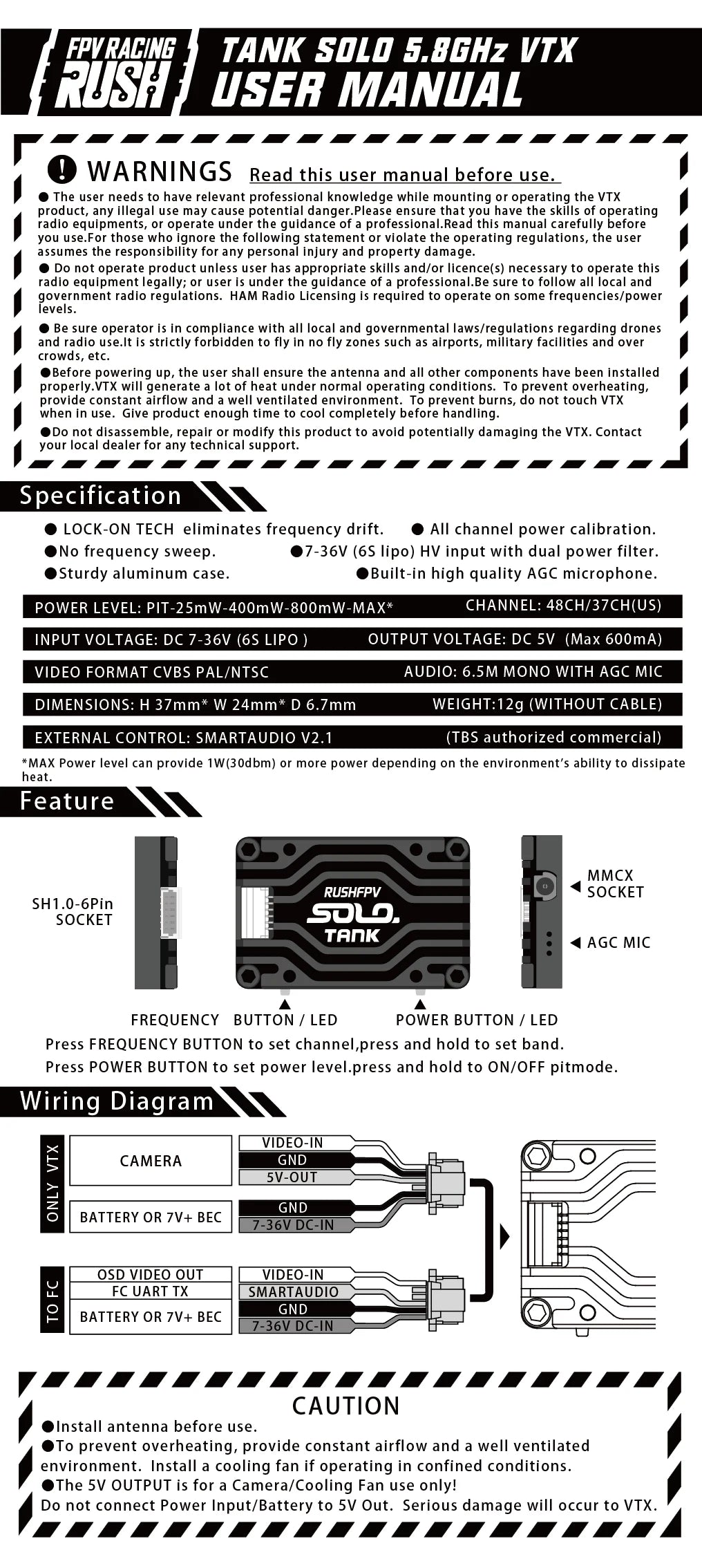 With support for 48 channels, adjustable power levels from 25mW up to 1.6W, and SmartAudio V2.1 external control, this VTX gives you the flexibility to optimize your signal strength for any environment. Compatible with CVBS PAL/NTSC video formats and powered by DC 7-36V (6S LiPo), the RUSH Solo Tank delivers high-definition, low-latency video to keep you in control and fully immersed in your flight.