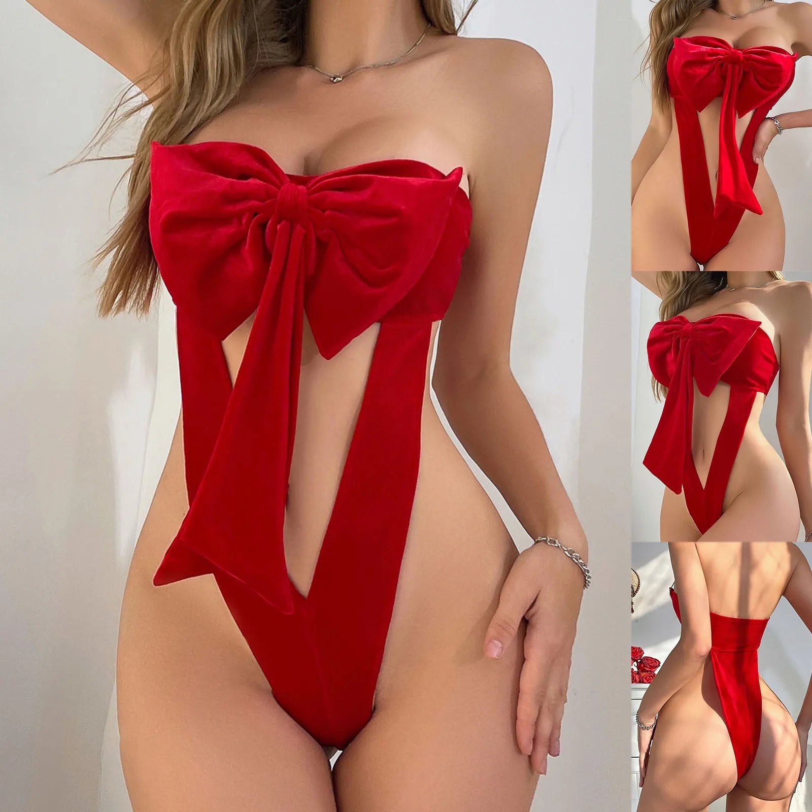 Sexy Women’s Strapless Red Velvet Jumpsuit – Hollow-Out Lingerie with Big Bow, Valentine’s Day Seduction Outfit
