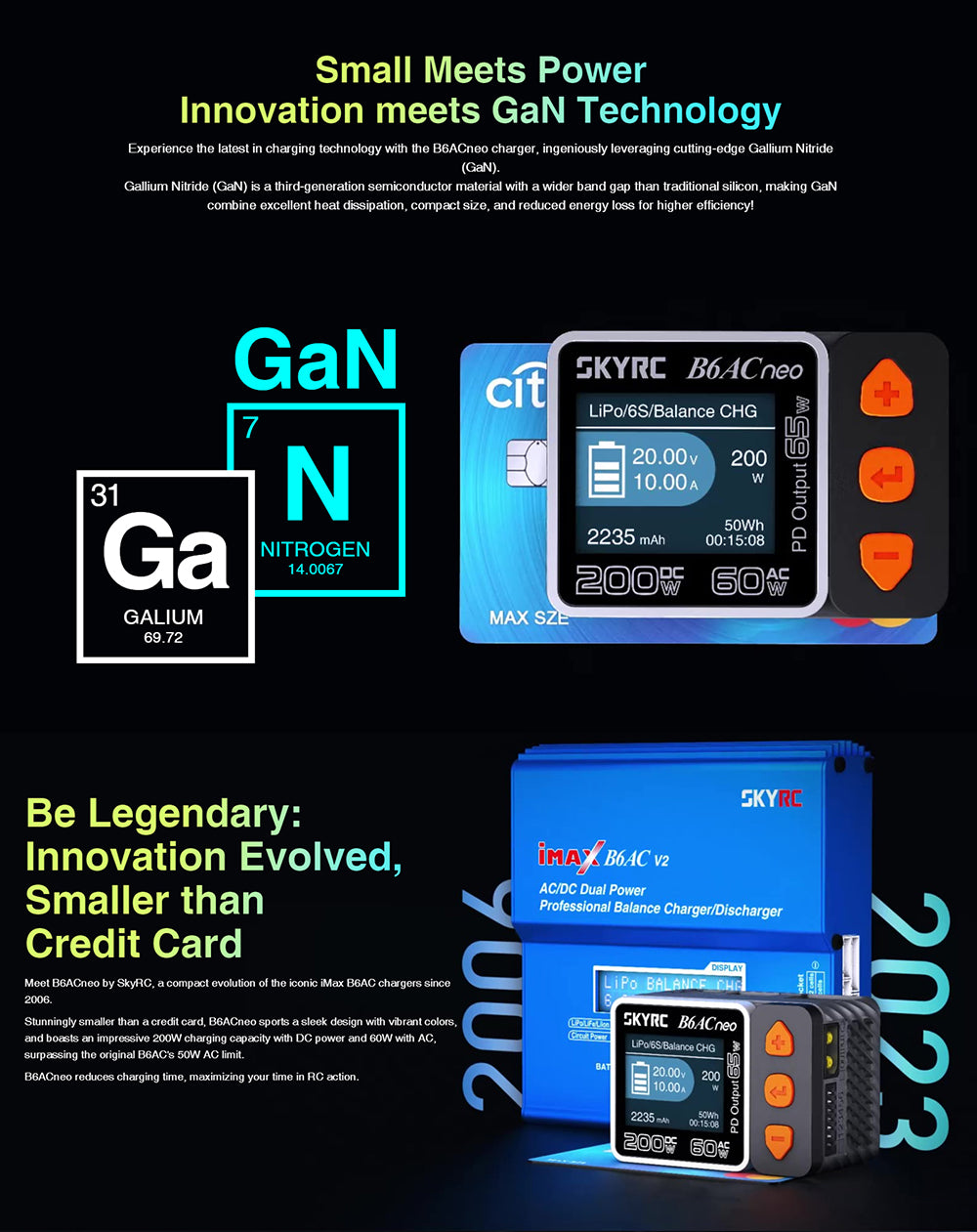 Looking for a powerful, reliable, and compact battery charger for your RC adventures? Meet the SKYRC B6ACneo, the upgraded version of the legendary iMAX B6AC! Whether you're charging LiPo, LiFe, Li-ion, LiHV, NiMH, NiCd, or Pb batteries, this versatile charger has got you covered.