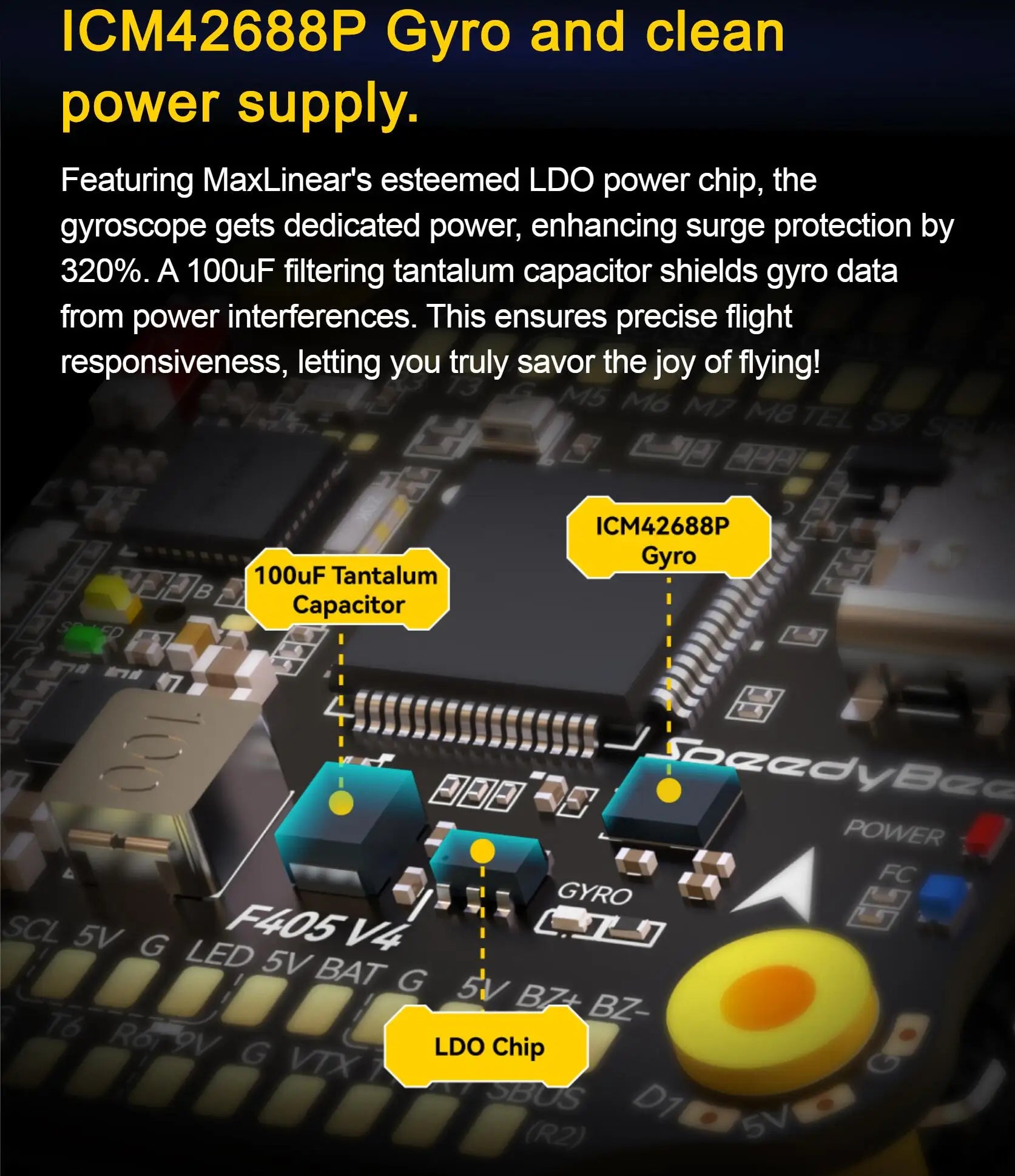Flight Controller (F405 V4): Powered by the STM32F405 MCU with ICM42688P Gyro, the SpeedyBee F405 V4 provides incredible precision and responsiveness for your drone’s flight. With Betaflight and INAV compatibility, it's perfect for both racing and cinematic drone enthusiasts.