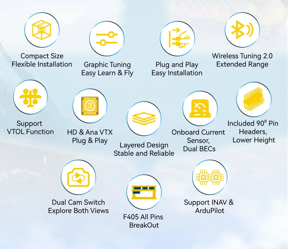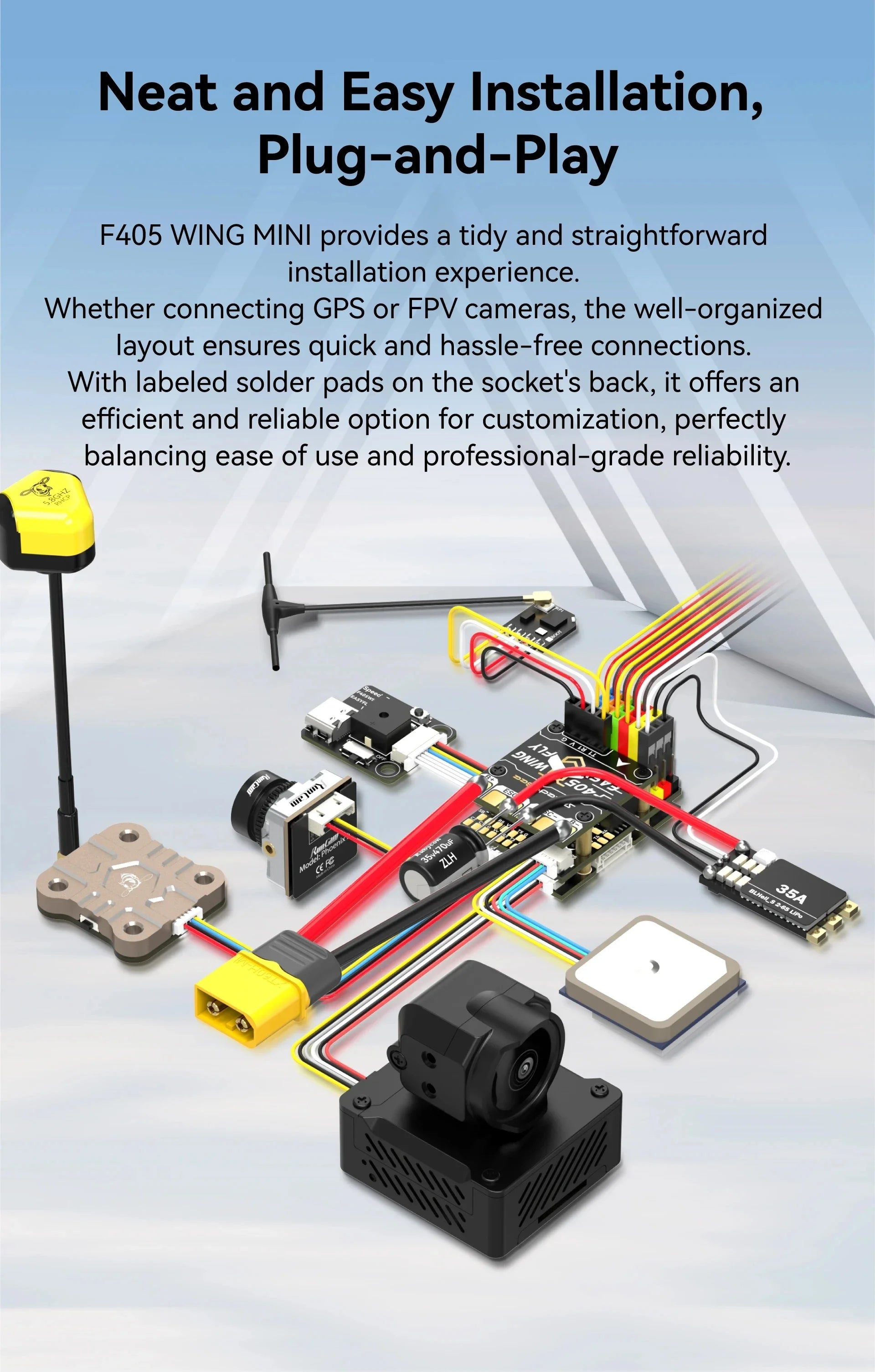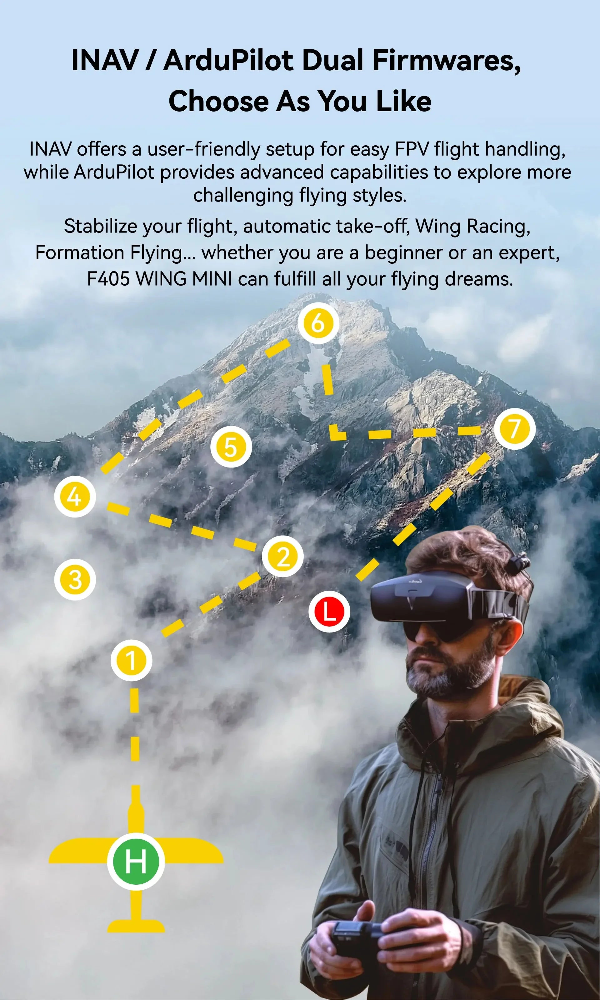 This controller also features built-in support for ELRS/CRSF receivers, SBUS input, dual analog camera switching, and multiple PWM outputs for servos, VTX, and camera integration. The lightweight 20x20mm form factor, combined with robust BEC outputs and TVS protection, makes the F405 WING MINI perfect for compact, high-performance fixed-wing RC airplanes. Compatible with INAV and ArduPilot firmware, this controller gives you full flexibility for advanced flight planning and autopilot features.