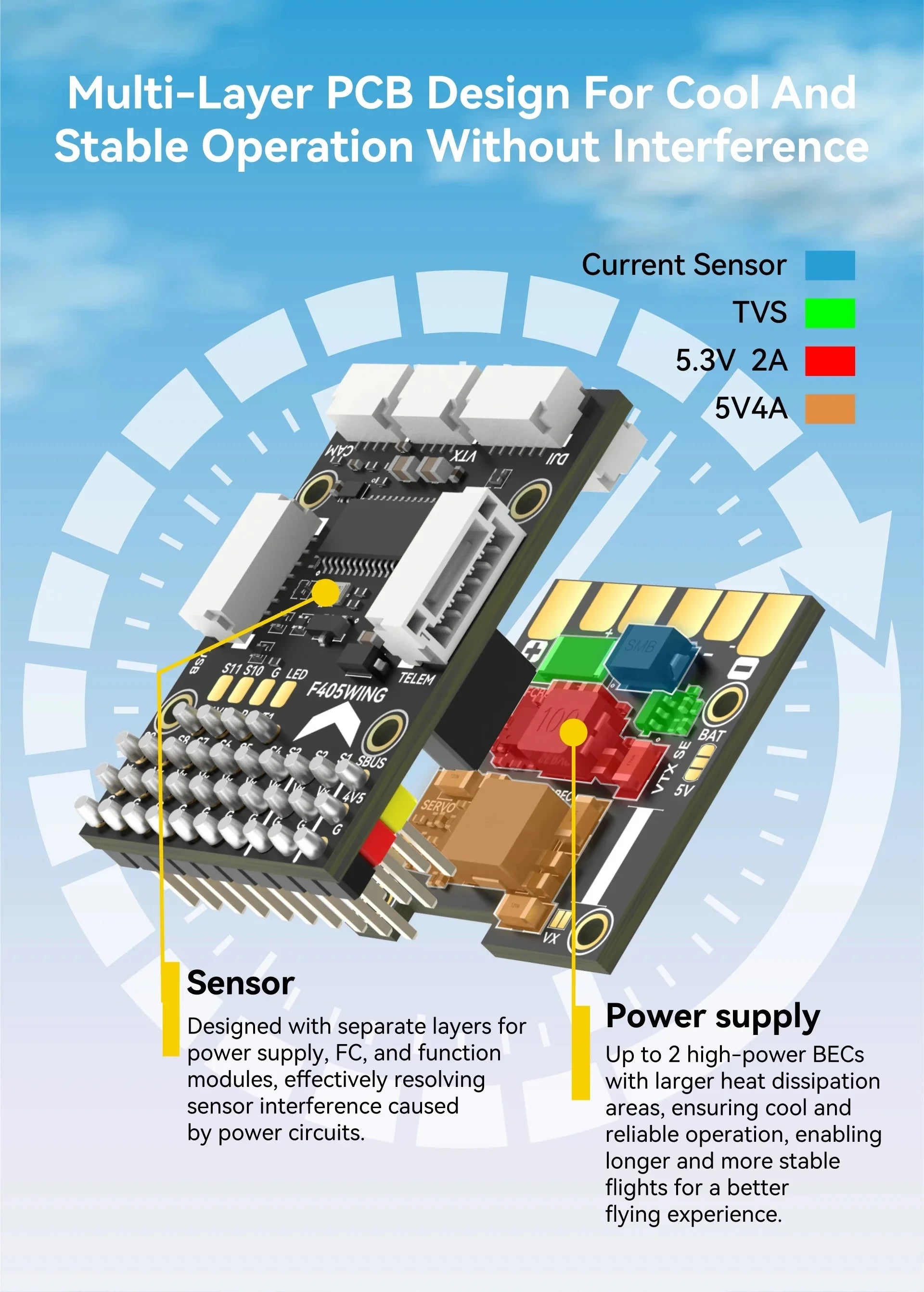 Servo & VTX Power Output: 5V/4A continuous, 5A peak for servos, cameras, and VTX.