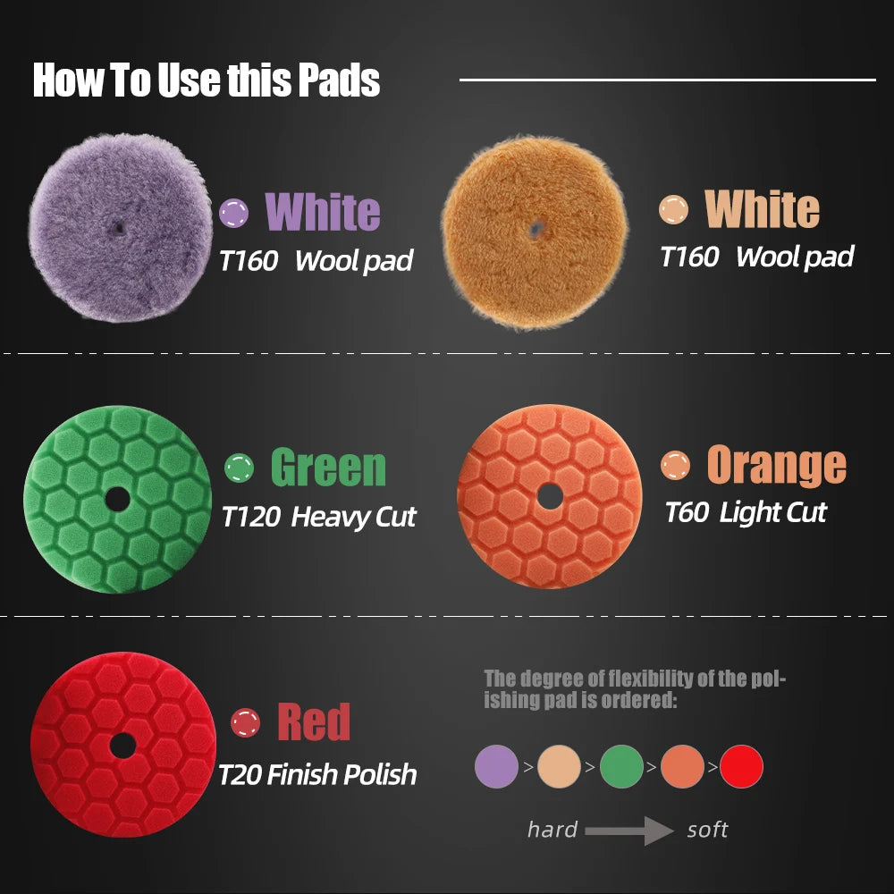 4. Advanced Design for Optimal Results: The pads feature a honeycomb surface design, which helps store excess polishing agent, reducing waste while ensuring even distribution. This design also helps regulate heat during polishing, preventing burnt paint or damage. Additionally, the bevel edge design protects your surface from scratches, while the middle hole design minimizes heat build-up and promotes smoother handling.