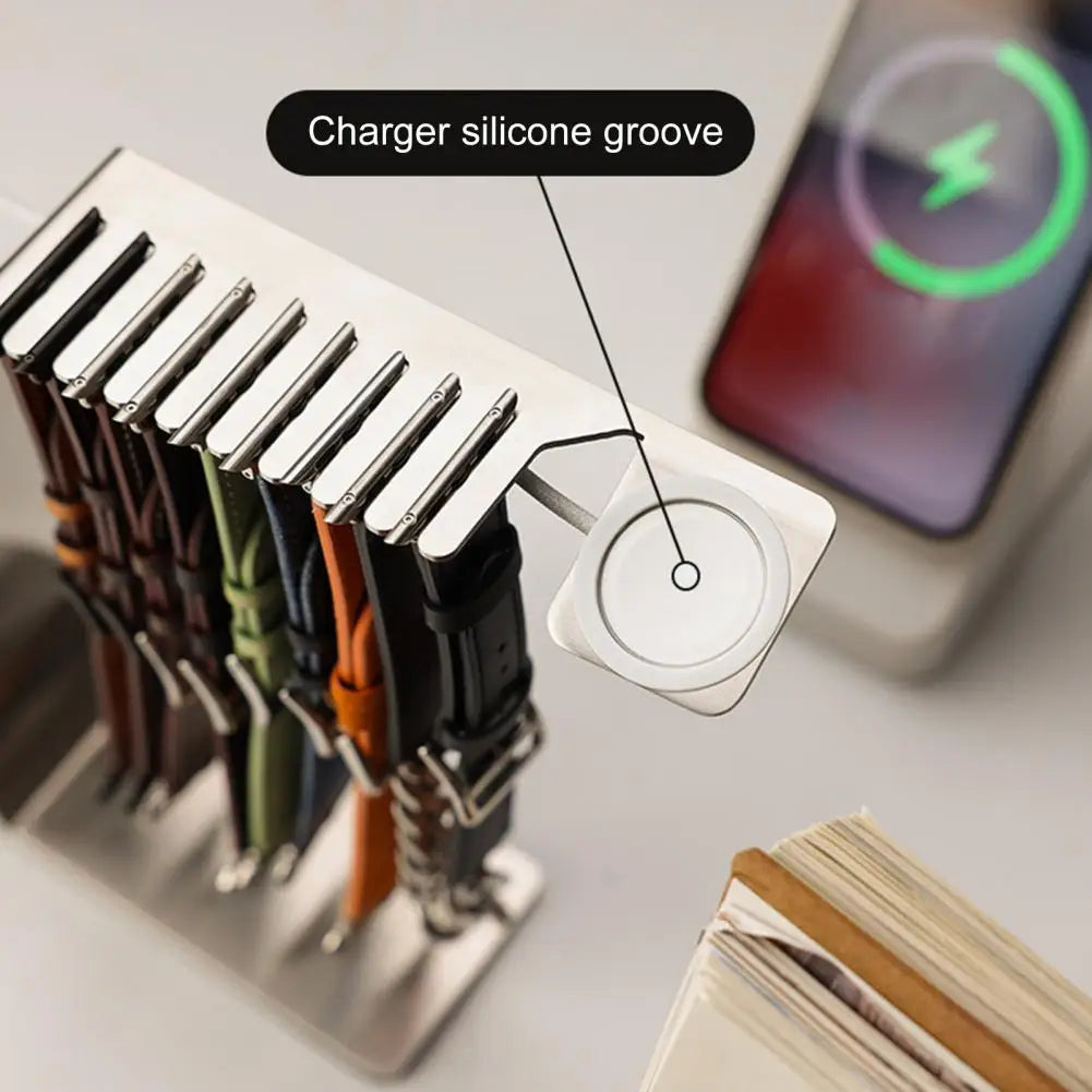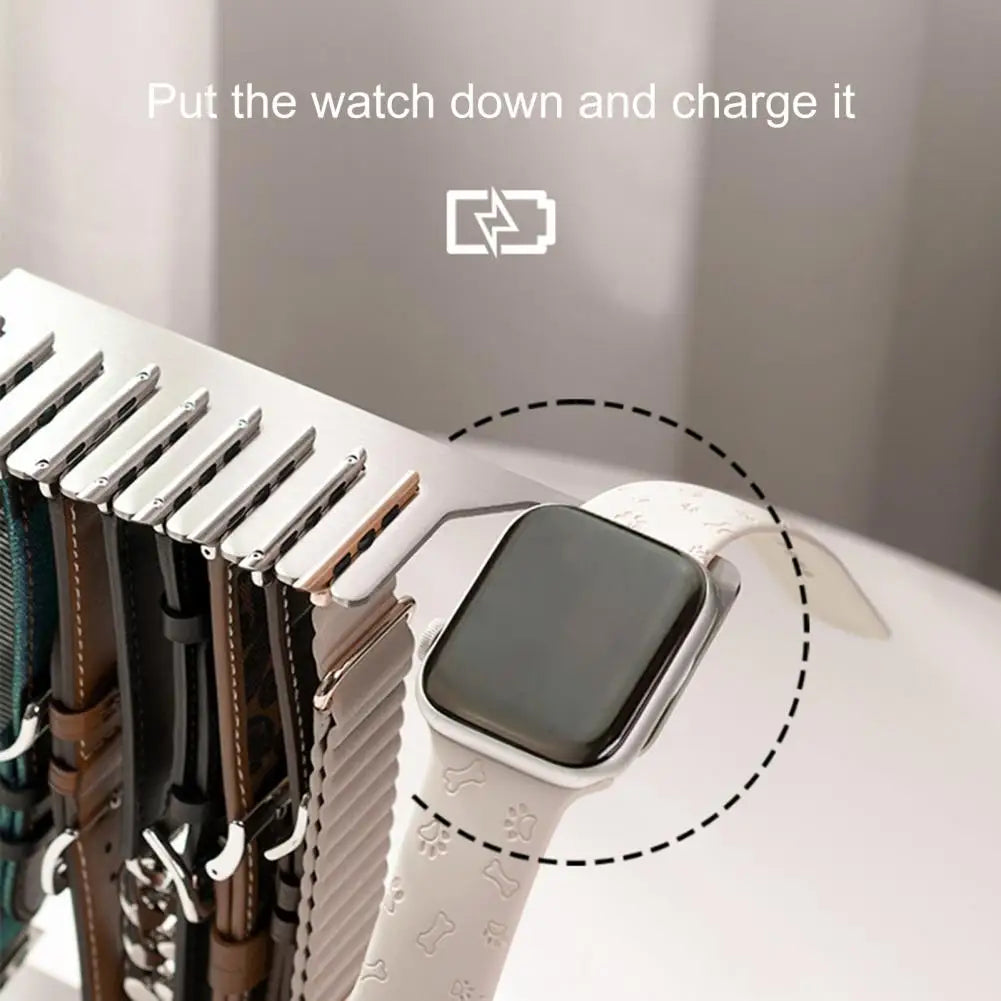 All-in-One Design: Say goodbye to cluttered desktops and hello to streamlined organization. Our 2-in-1 design doesn't just charge your Apple Watch; it also acts as a sophisticated holder for your watch bands. Keep everything in one place, ensuring your space stays tidy while your accessories remain easily accessible.