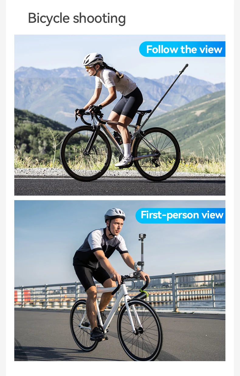 The 1.2M to 3M carbon fiber selfie stick extends to capture wide-angle shots from a distance. This lightweight and durable design is 1/3 lighter than traditional aluminum selfie sticks, ensuring comfort and ease during long rides.