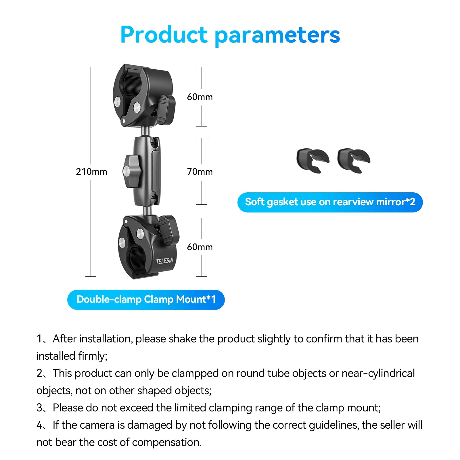 Featuring a bionic crab pincer clamp design, this mount offers exceptional grip, ensuring your camera stays secure throughout the ride. Whether you're mounting on a car, tube, bike, or motorcycle, the TELESIN is designed for quick assembly and disassembly, making it a breeze to use.