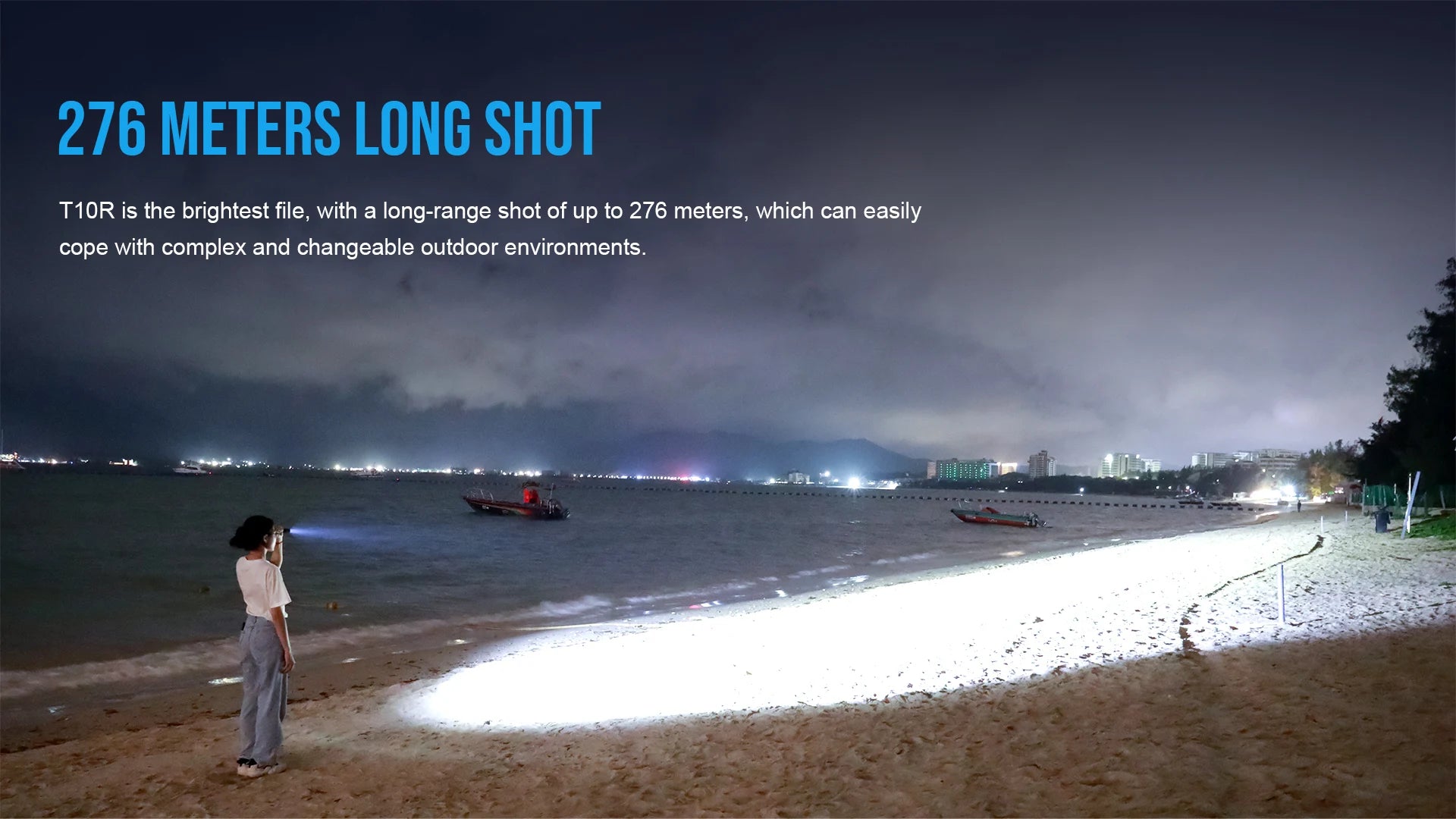 Crafted from durable aluminum alloy and rated IP68 waterproof and dustproof, the T10R is built to withstand rugged environments. It features dual switches—a tail tactical button for instant ON/OFF and a neck switch with multiple brightness modes (candle, low, medium, high) and strobe function—giving you precision control at your fingertips.