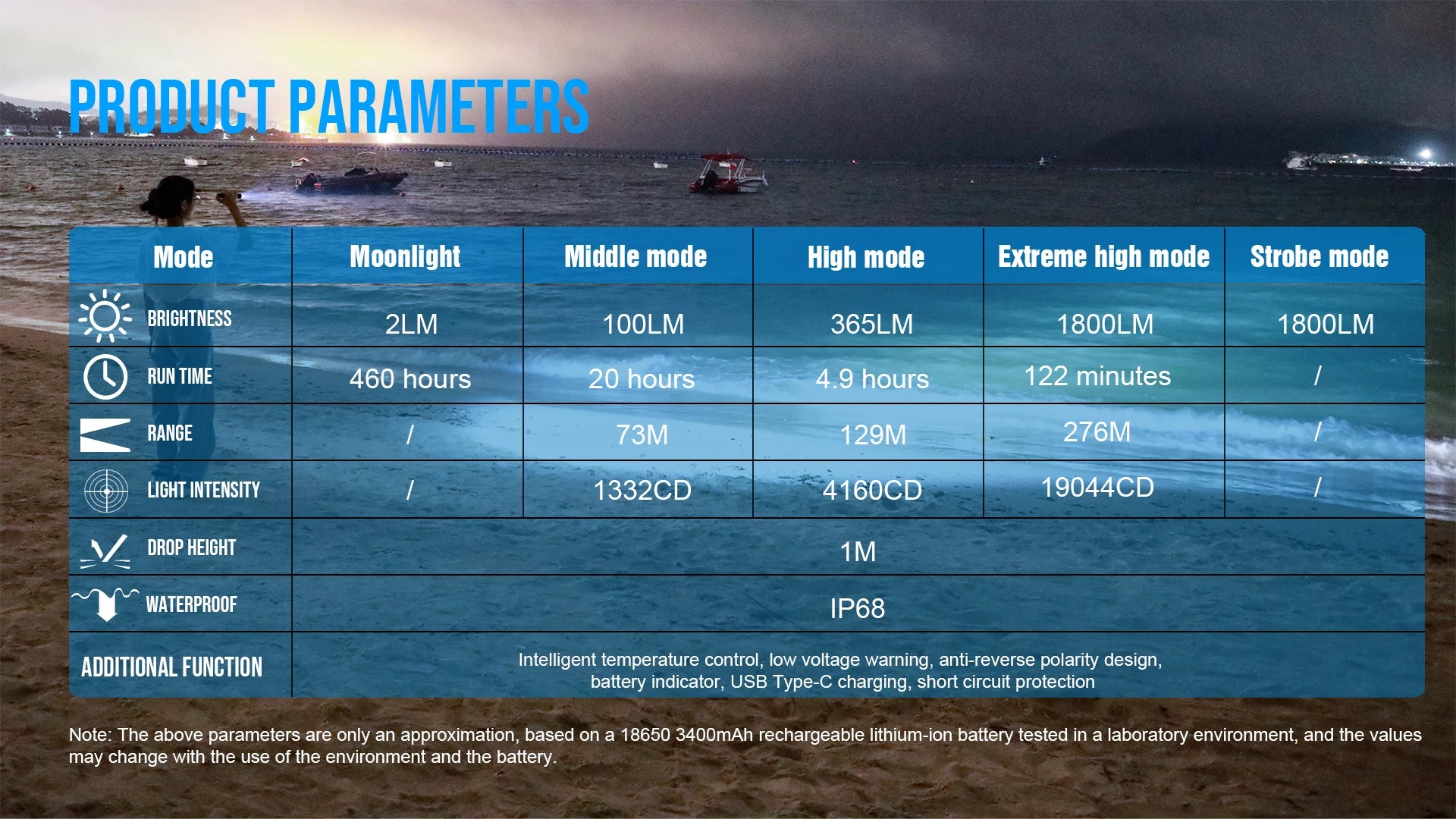 High Power LED: 1800 lumens with T6 LED, ultra-bright and long-range (up to 276 meters)