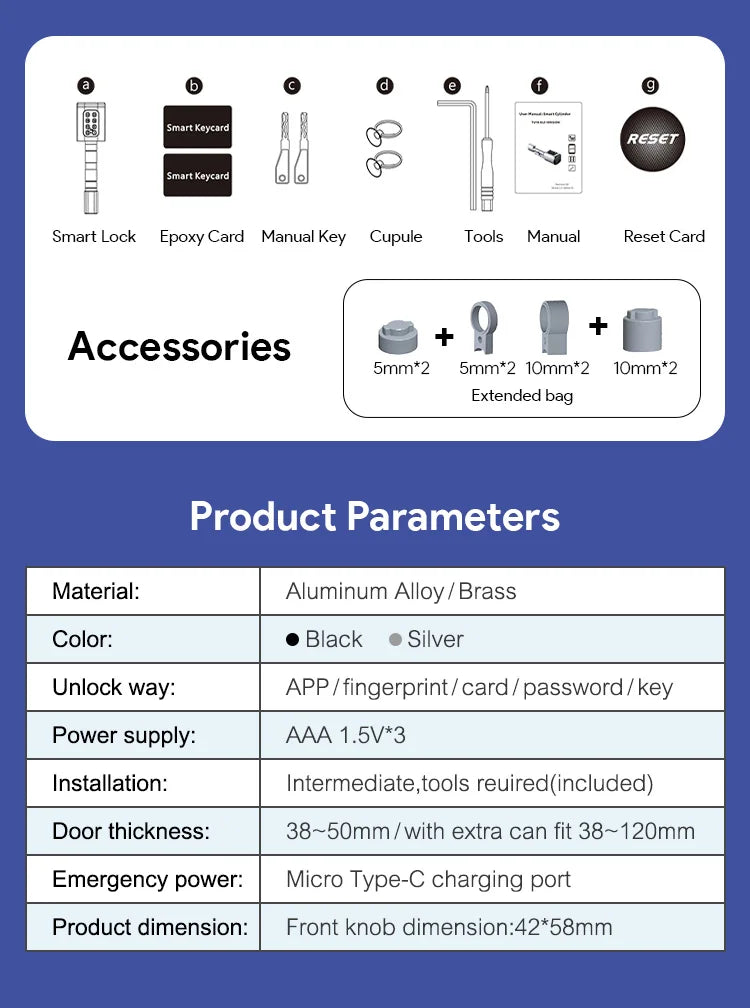 5 Unlock Methods: Fingerprint, Password (one-time, periodic, permanent), RFID Card, Mechanical Key, App Control