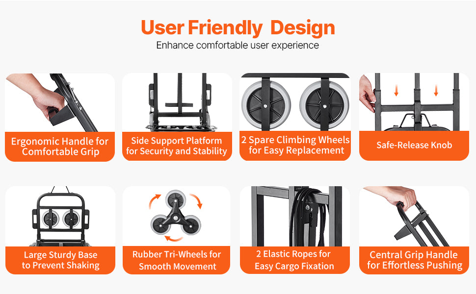 Dual ergonomic handles make pulling or pushing a pleasure, while the included elastic ropes secure your load. When the job’s done, the cart folds quickly for compact storage — slip it into your trunk, garage, or closet without hassle. From everyday errands to professional moving tasks, the VEVOR Stair Climbing Cart makes heavy lifting simple, safe, and efficient.