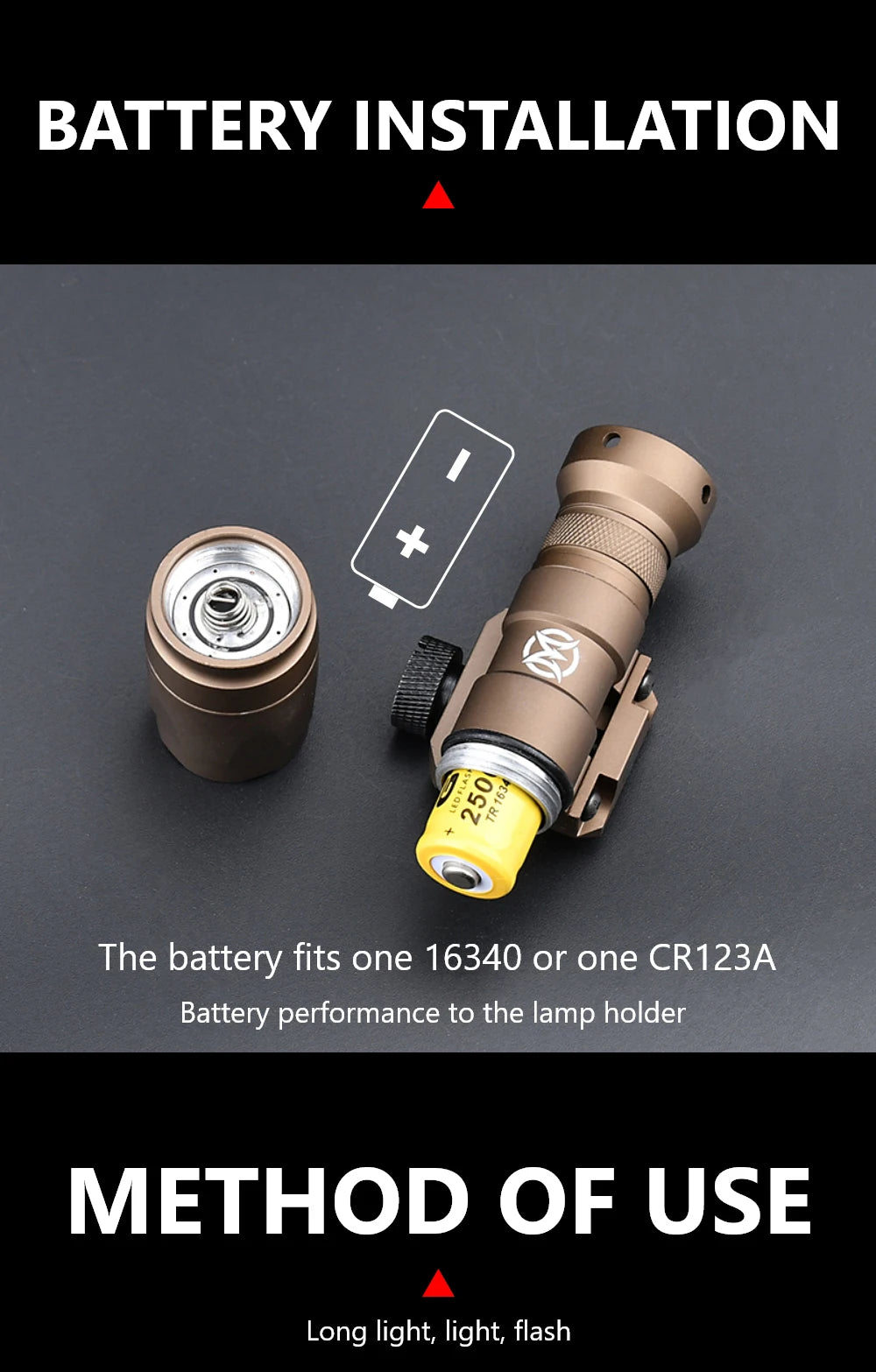 The WADSN Surefir M300A Mini Tactical Flashlight is a high-performance, ultra-compact weapon light designed for hunting, tactical missions, and self-defense. This powerful LED scout light fits seamlessly onto a 20MM Picatinny rail, providing both momentary-on and constant-on tail switch functions for quick, reliable illumination when it matters most.