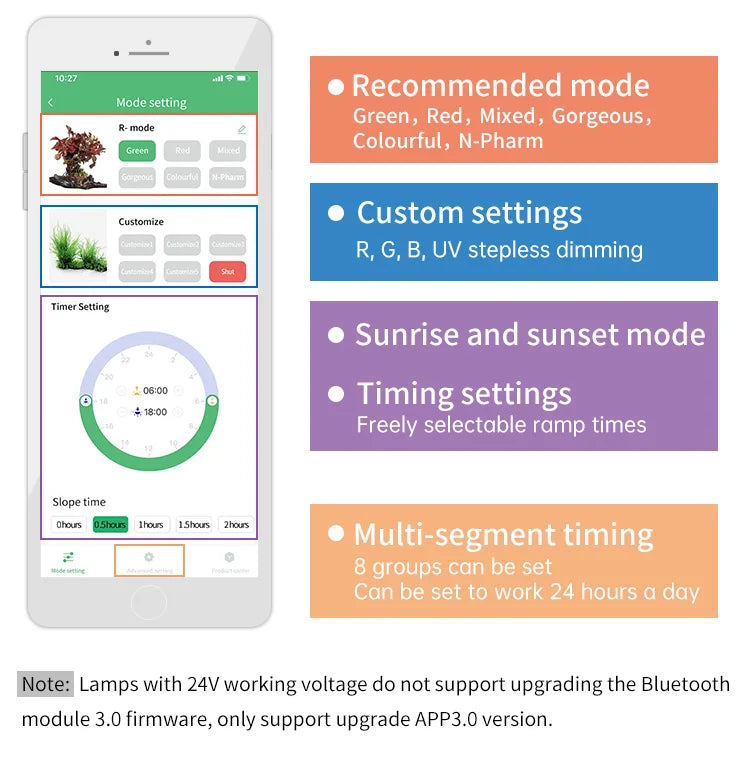 APP Bluetooth Control: Six preset modes, five custom modes, stepless dimming, sunrise & sunset simulation.