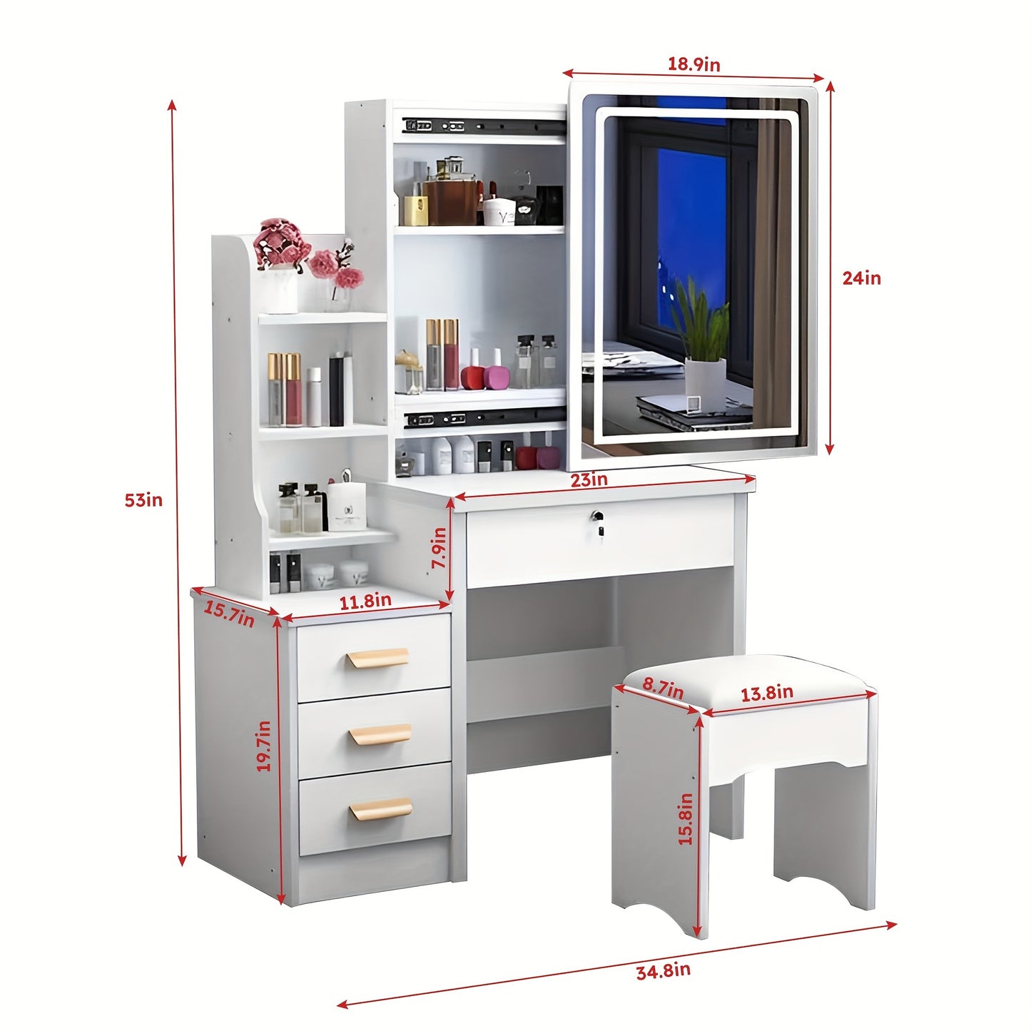 Create a luxurious and organized vanity area with this White Dressing Table with Sliding Mirror & Stool. Combining contemporary style, ample storage, and practical features, this dressing cabinet is the perfect solution for enhancing your bedroom's elegance and functionality. Upgrade your space today and enjoy the perfect blend of style and convenience!