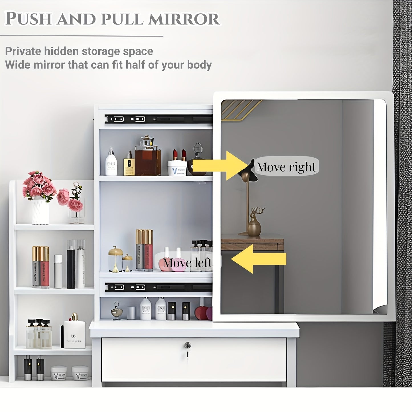 Sliding Mirror with Hidden Storage Cabinet: The sliding mirror not only serves as a functional vanity mirror but also reveals a hidden storage cabinet behind it. This clever design allows you to store and access your beauty products and accessories easily, keeping your space clutter-free and organized.