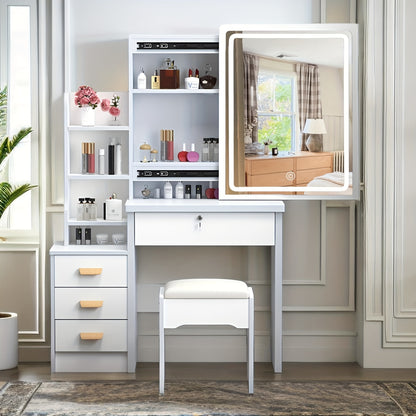 White Dressing Table with Sliding Mirror and Stool - 4 Drawers, High-End Bedroom Cabinet, Integrated Design for Small Apartments