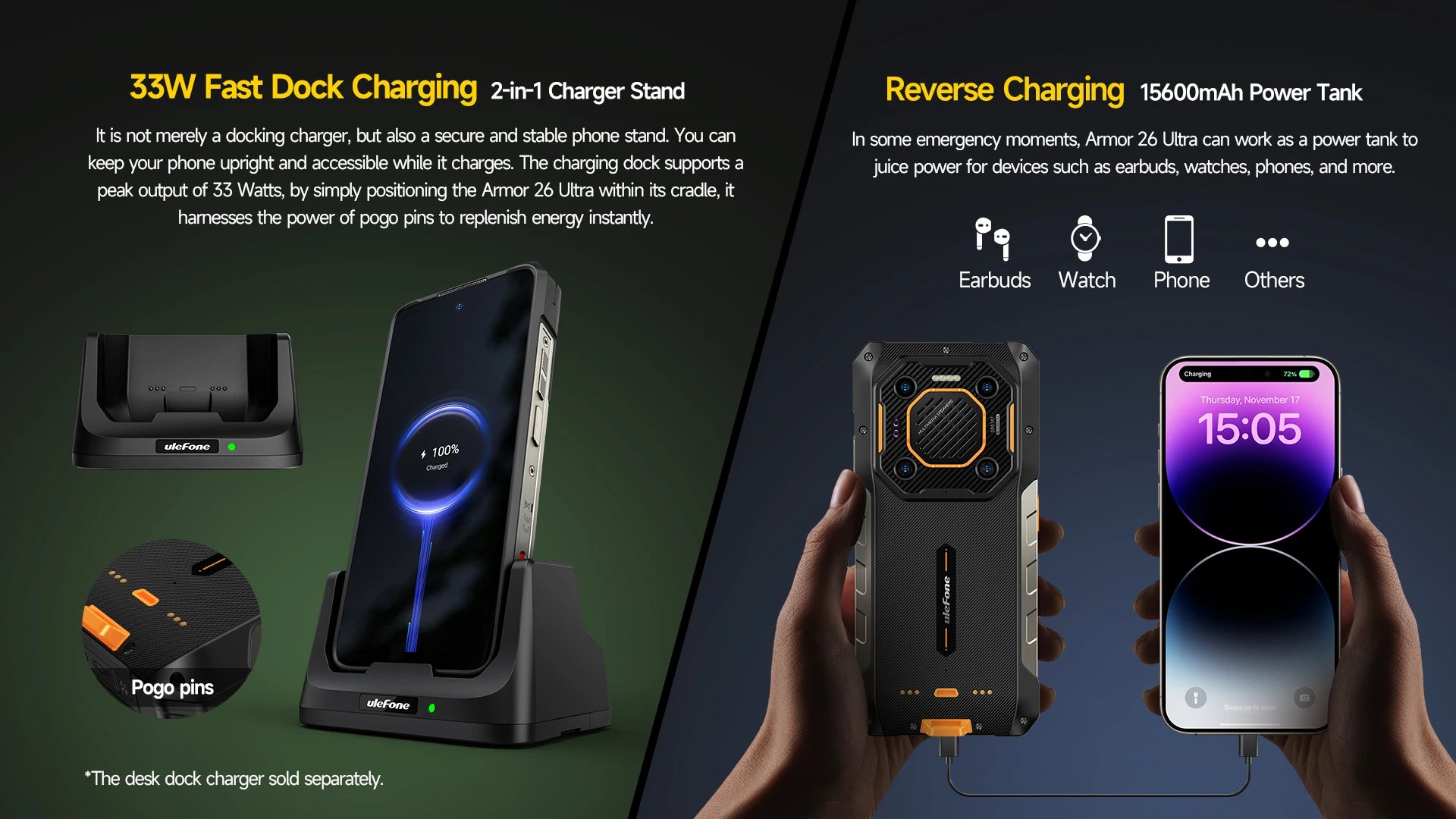 - Unstoppable Power: Featuring an impressive 15600mAh battery, the Ulefone Armor 26 Ultra ensures you're never left stranded without power. With 120W flash charging, just 5 minutes of charging gives you up to 9 days of standby, keeping you connected and powered up for all your adventures.